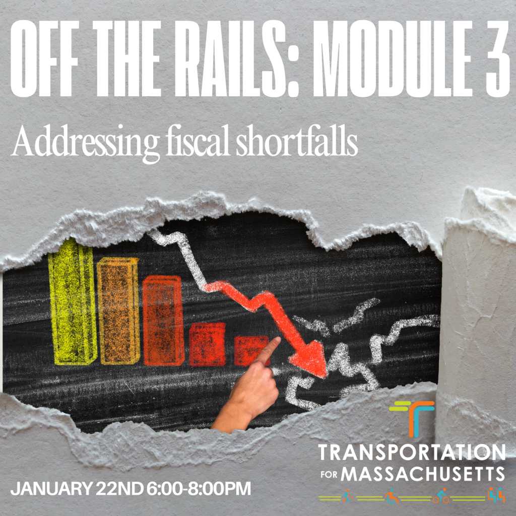 Module 3 – Off the Rails: Addressing Fiscal Shortfalls – Participate to learn about what is needed to ensure robust public transit across the state, including from Regional Transit Authorities, the MBTA, and micro-transit. Together we will consider how our public transit systems impact individual decisions and have the potential to support equity for Black, brown, low-income and working class people. With Sofia Owens, Alternatives for Community and Environment.